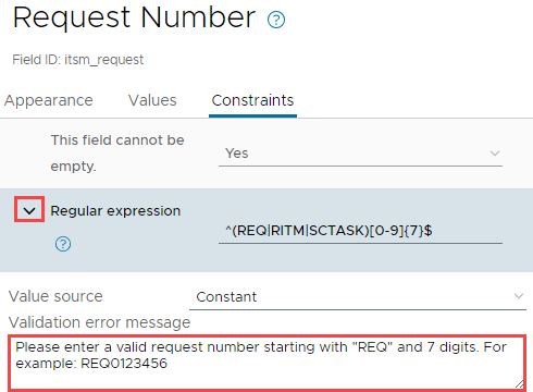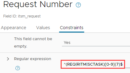 - Value must begin with the letters “REQ“, “RITM“, or “SCTASK“.