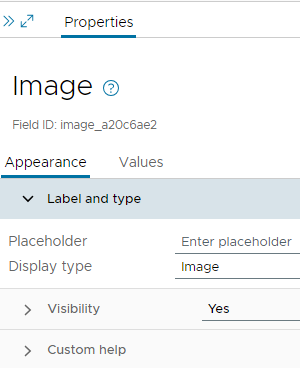 - Return to the custom form in Service Broker and click on the image tile you dropped on the Canvas previously. Click on the “Values” tab from the Properties pane, if needed.