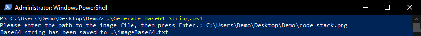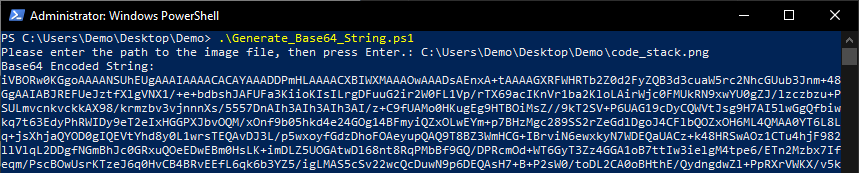 PowerShellThis time, the script prompted the user to input the path of the image file, generated the Base64 encoded string, and saved it to the working directory where PowerShell was executed!