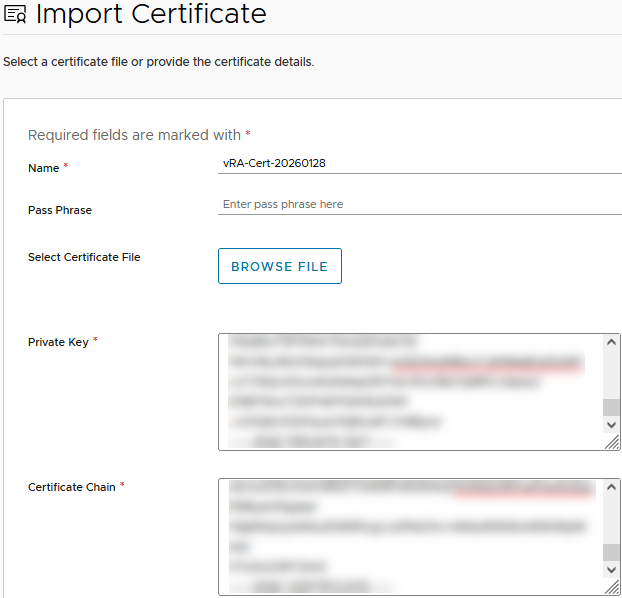 Type a unique name for the certificate inside the “Name” field. This label will be reflected in the future when you choose to assign this certificate from the Locker. It is recommended to follow a standard naming convention to avoid confusion. In this example, I am using “vRA-Cert-YYYYMMDD”