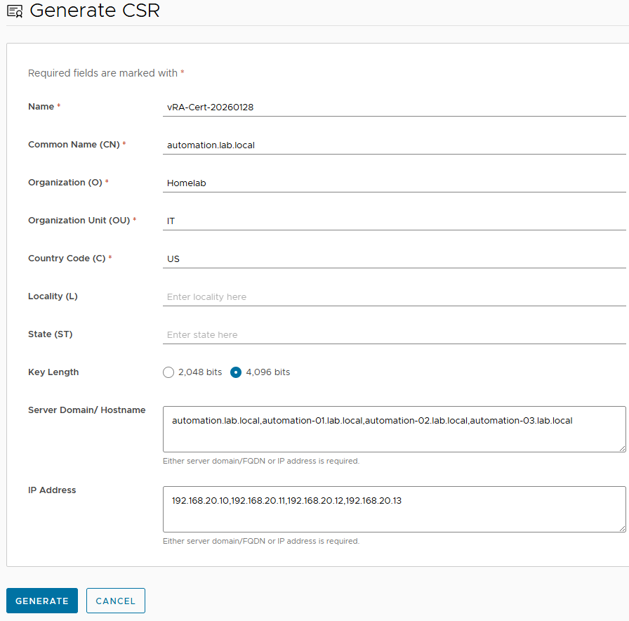 The “Common Name (CN)” field should reflect the load balanced Fully Qualified Domain Name (FQDN) of your Automation instance.