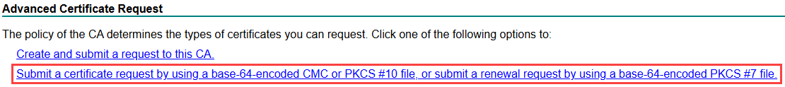 Click on the “Submit a certificate request by using a base-64-encoded CMC or PKCS #10 file, or submit a renewal request by using a base-64-encoded PKCS #7 file.” link.