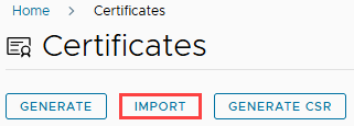 Return to the browser tab/window with Aria Suite Lifecycle open. On the Certificates page, click on the “Import” button.