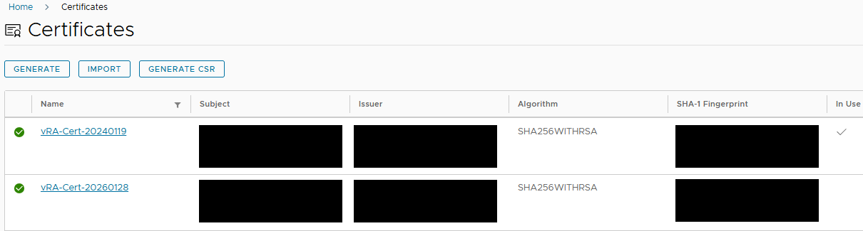 The certificate will now appear on the “Certificates” page. Notice the “In Use” column indicates which certificate is bound to one or more applications managed by Aria Suite Lifecycle.