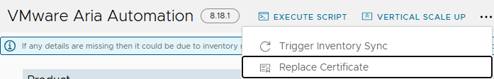 It is recommended to “Trigger an Inventory Sync” prior to making any changes to ensure Aria Suite Lifecycle has synchronized the most current information for the product. Click on the ellipsis (“…“) button, located along the ribbon, then click on the “Trigger Inventory Sync” menu item.