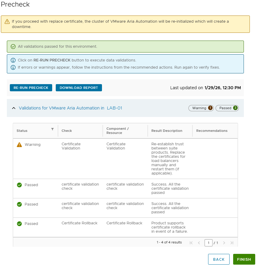 Precheck results appear. Assuming all checks pass, the “Finish” button will illuminate at the bottom-right of the window. Note that a “Warning” message may appear indicating that you may need to re-trust relationships between Automation and other products, such as Operations, if configured. In addition, if Automation is served behind a load balancer which presents the SSL certificate to users (passthrough not enabled), then the certificate must be updated on the load balancer as well.