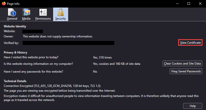 The “Page Info” window appears, with the “Security” tab selected. Click on the “View Certificate” button.