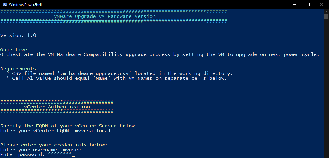 The “real work” begins: The script will check if the current Hardware Version is less than the desired version. If so, the vCenter Server is instructed to set a flag on the VM to upgrade at next power cycle. If the current Hardware Version for the specified VM already meets the criteria, meaning its Hardware Version is greater than or equal to the desired version, then no action will be taken and the VM is simply skipped. In the event of an error, a message will appear in the PowerShell terminal and written to log, and the script will proceed to the next VM, if applicable. Lastly, the script will disconnect the user PowerCLI session once all tasks are complete.